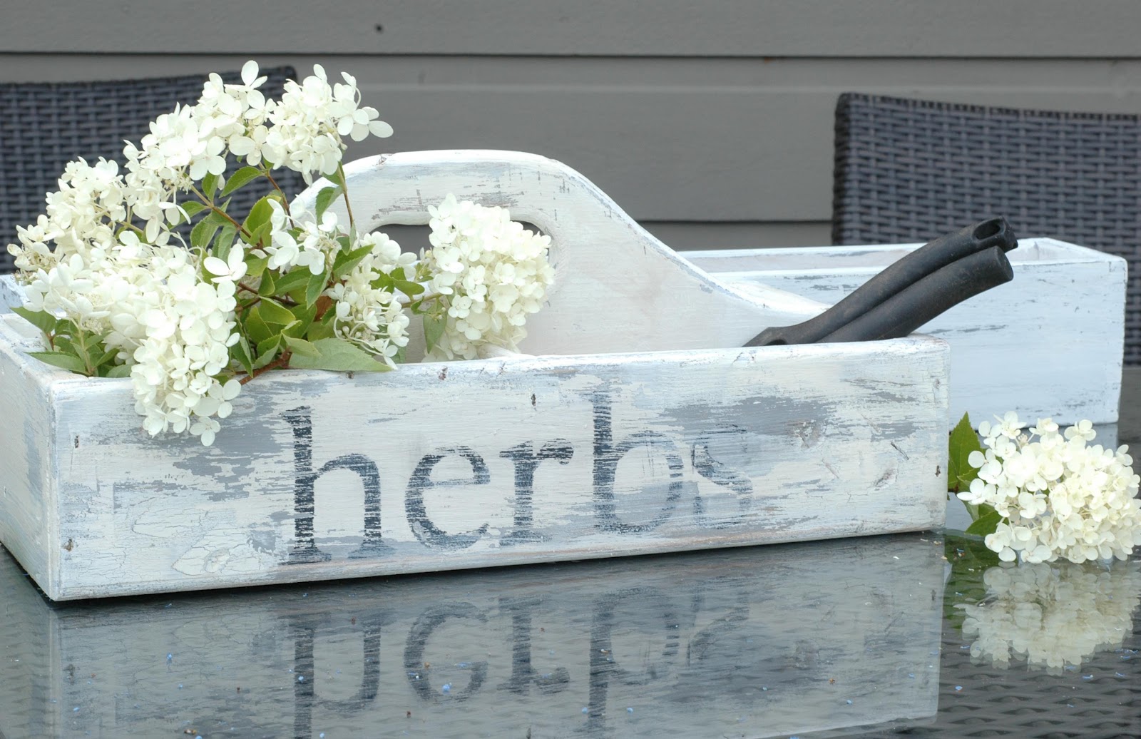 Now my favorite project of them all - and more time consuming... I am a quick and easy kind of project girl and this took a few steps - I almost gave up, glad I didn't. No before picture but it was an unpainted wooden planter that I paid $2 for. I painted it gray, rubbed with vaseline, painted white and then scraped away some of the white (where the vaseline was). I then stencilled the word herbs on (cut with my Cricut), which were too black so I sanded them down. I then didn't really like the big gray patches as they were so I painted on some crackle medium and over painted lightly with white - which of course was a different white than I had done earlier because I had used up the household paint and now had to use my acrylic paint. I got some crackle - would have been happy with more but I am a newbie at using crackle medium so I took it easy. Anyhow, now the new white was too white - see where I am going here almost losing interest in it! Then I decided to try to tea stain it... voila, I now love it!